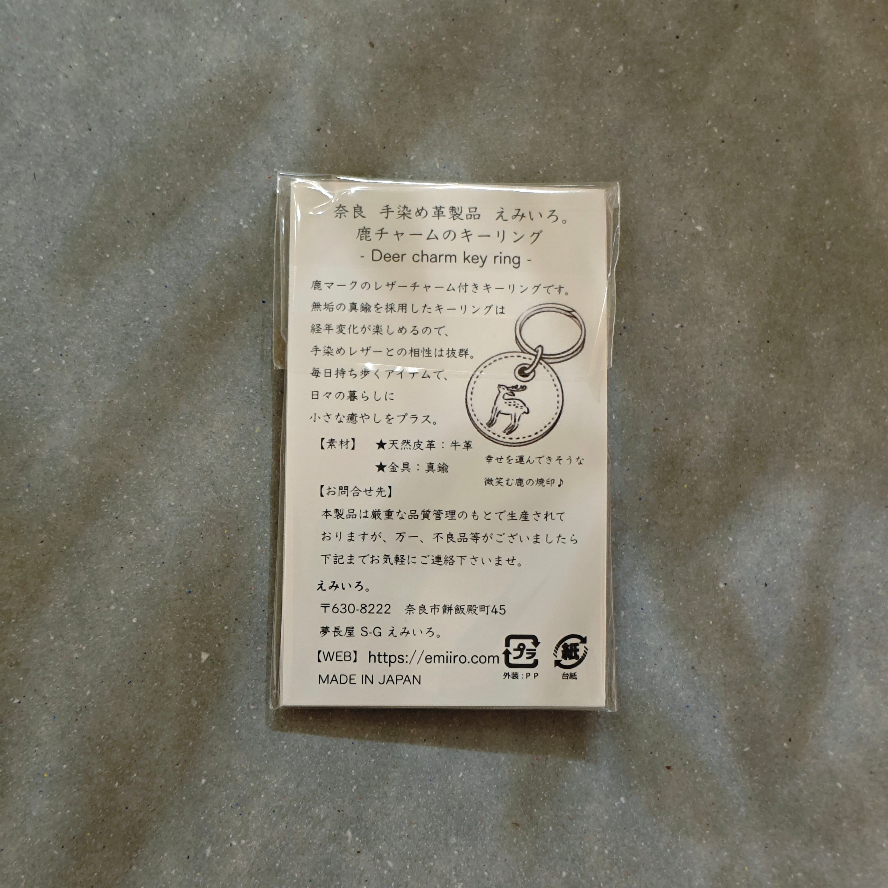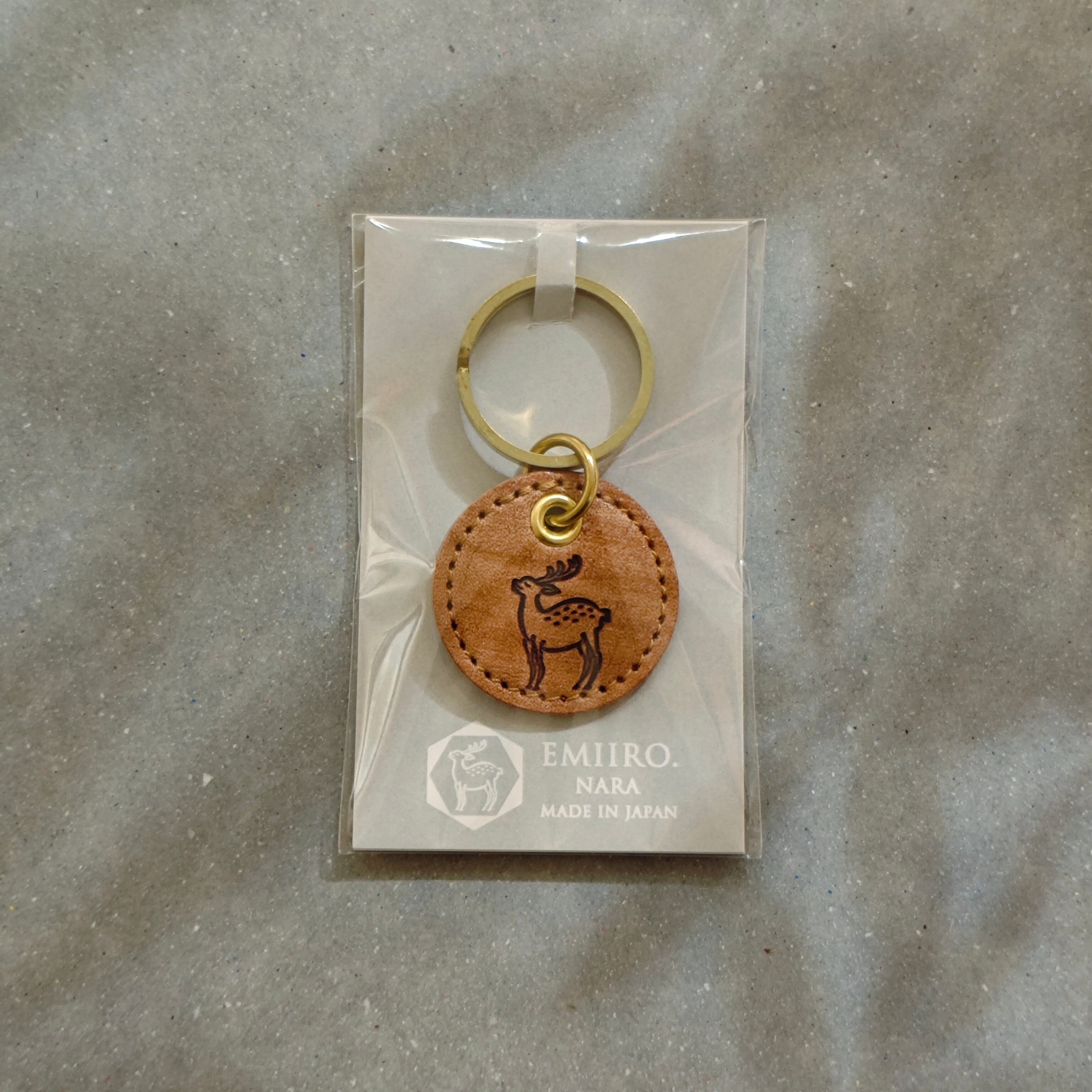 鹿マークの焼印を入れたレザーチャーム付きキーリングです。